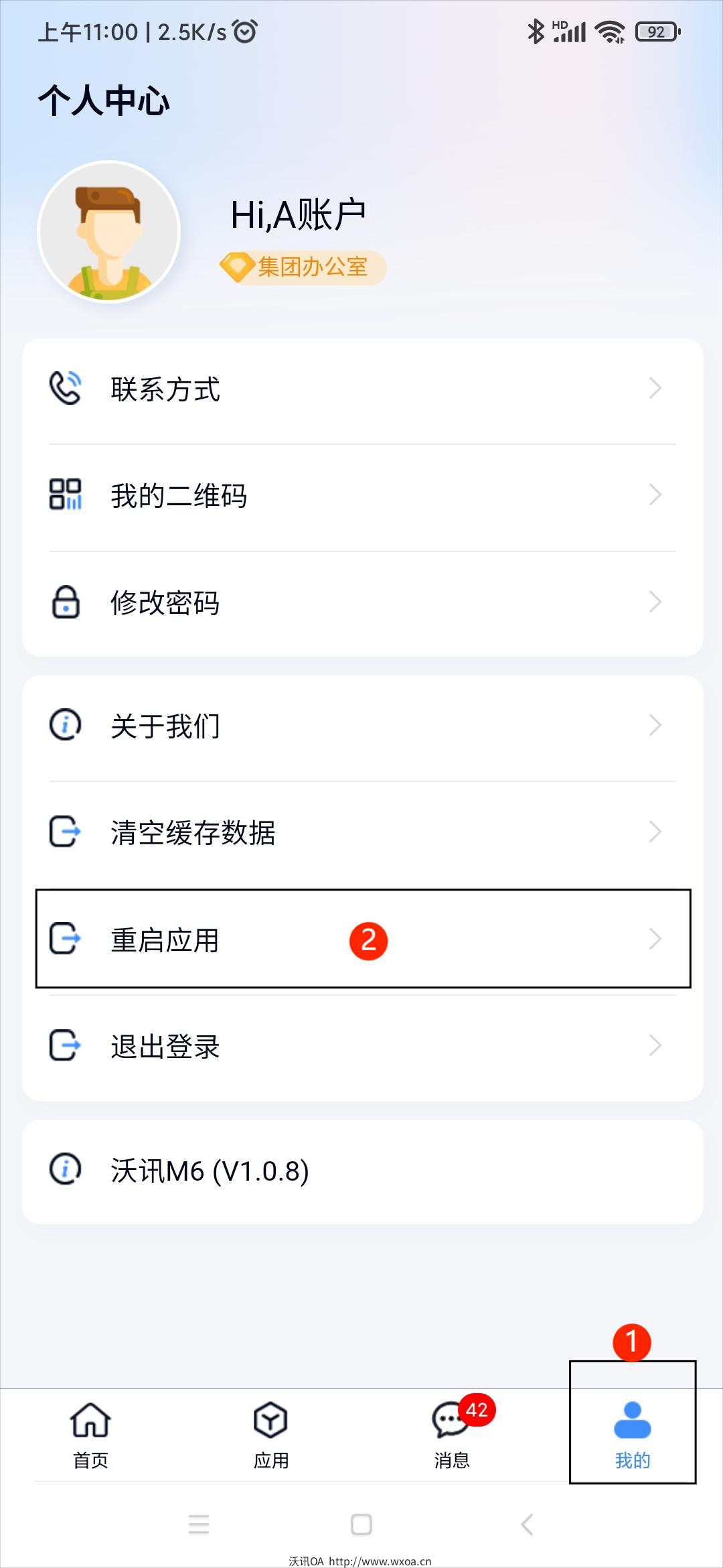1. 若本手机之前安装并登陆使用过沃讯M6的APP,但因 软件服务器的 IP地址 或 端口号 变更了,则 也需要点击 APP右下角的 【我的】,点击 【重启应用】,再次登陆即可。