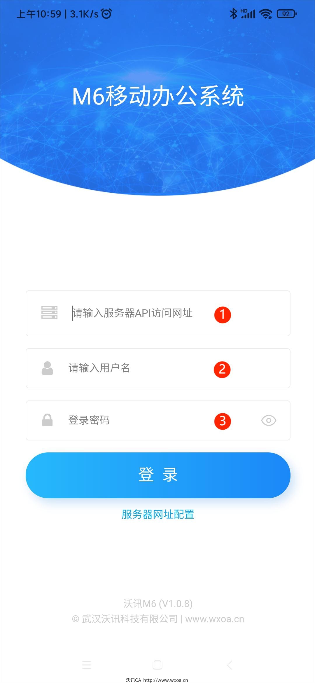点击运行沃讯M6 APP后,在登陆页面,点击 【服务器网址配置】